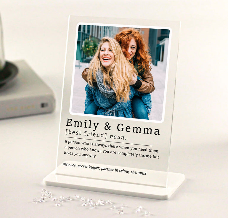 Custom Best Friend Definition Photo Acrylic Plaque with slimline stand. NO ADDITIONAL FRAME PURCHASE REQUIRED! Ready to gift to the recipient or send directly with no hassle of buying a frame