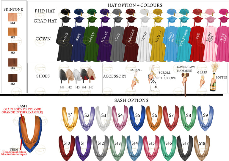 - Gown & sash colour (match university where possible)