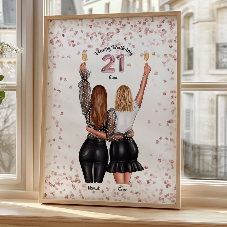 Personalised Best Friends Unframed Print, Birthday Gift - Customise Name, Hair and skin colour UNFRAMED BALLOON NUMBERS CAN BE CHANGED