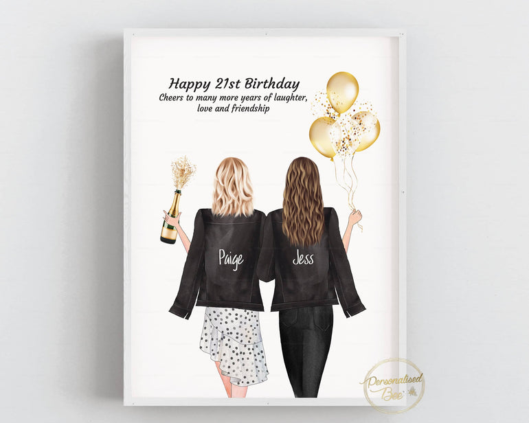 Personalised Best Friends Unframed Print, 21st Gold Balloons Birthday Gift - Customise Names, Clothing, Hair and Skin Colour