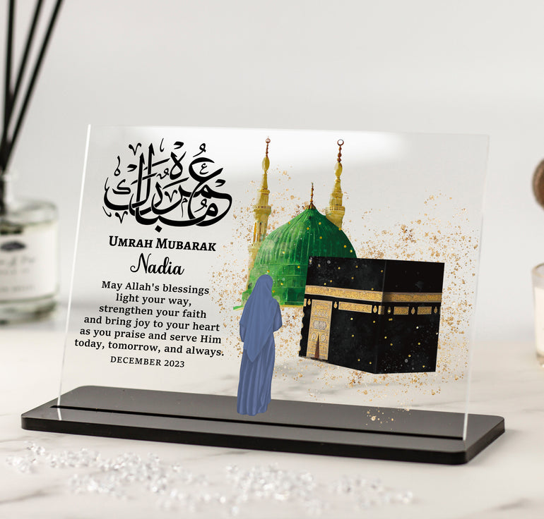 Crafted from high-quality clear acrylic, this plaque features a beautiful Muslim Kaaba Art design, complete with a female Hijab character. With its slimline stand, this plaque is the perfect addition to any desk or shelf.