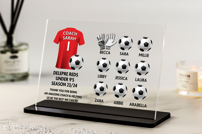 Surprise your Football Coach with a unique, personalised gift with all the team players names! This beautiful acrylic plaque features your custom football team Shirt along with the names of each team member. Quality and affordable, show you care with the perfect gift for End of Season, birthdays and christmas.