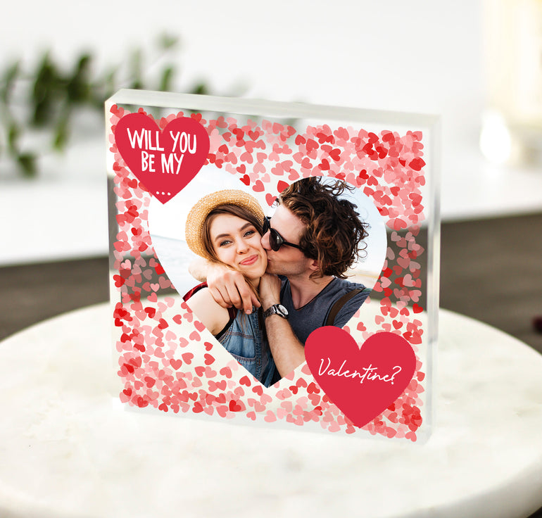 Our Customisable Freestanding Will You Be My Valentine Photo Acrylic Block makes ta cute, special gift for girlfriends, boyfriend, husband, wife or even to Mummy or Daddy from children