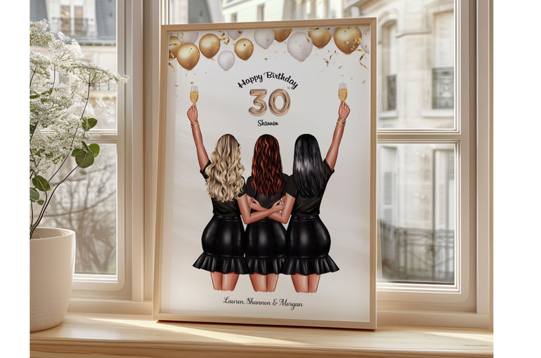 30th Birthday Gift for Her - 3 Best Friends Personalised Illustration Print