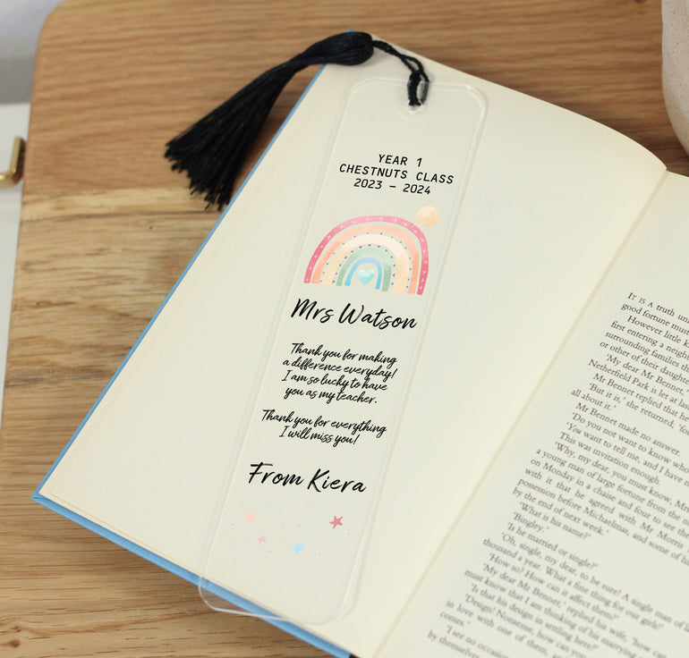 Designed as a practical and thoughtful present, the bookmark is an ideal gift from the whole class or individual students. Crafted with care from high-quality materials, it features a sturdy design that can withstand the test of time. The smooth and elegant surface of the bookmark is perfect for resting fingers while reading, while the personalised message serves as a constant reminder of the positive impact the teacher has had on their students' lives.