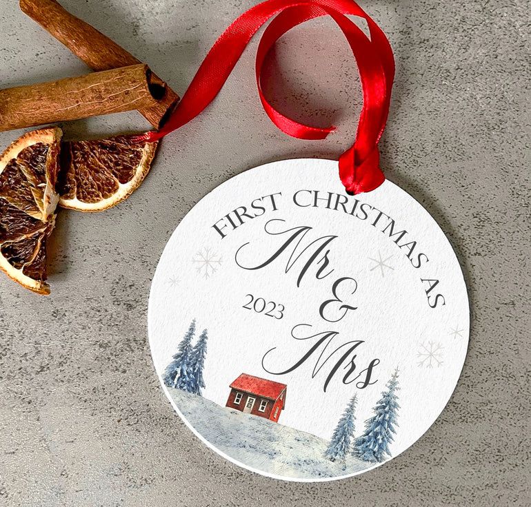 Personalised First Christmas as Mr & Mrs Christmas Bauble, Christmas Ornament for couple, family, friend Illustration acrylic ornament with a choice of ribbon to add a special touch to your Christmas tree. Crafted with love and care, this personalised acrylic hanging ornament makes the perfect Christmas gift.