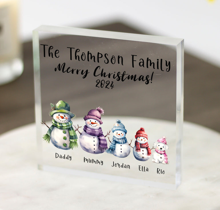 A unique Personalised Christmas Acrylic Block, Family member Snowman Illustration acrylic ornament for a Christmas together to add a special touch to your Christmas decor. Crafted with love and care.