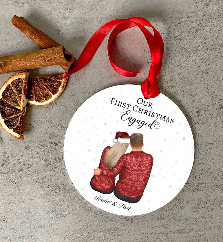 Personalised First Christmas Engaged Christmas Bauble, Custom Couple Illustration acrylic ornament for a Couples First Christmas newly engaged with a choice of ribbon to add a special touch to your Christmas tree. Crafted with love and care, this personalised acrylic hanging ornament makes the perfect Christmas gift for couples to celebrate their first Christmas engaged.
