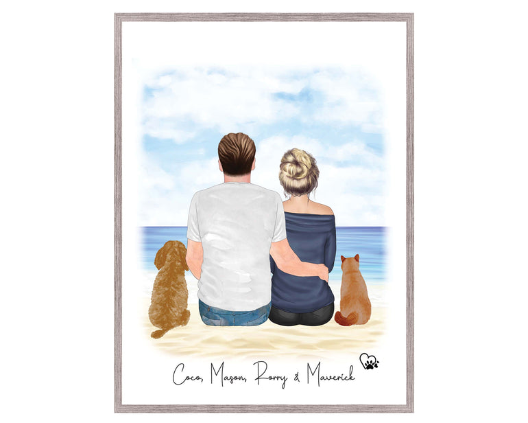 Couple and Pets Illustration with Beach and Sea Background - Personalised Print