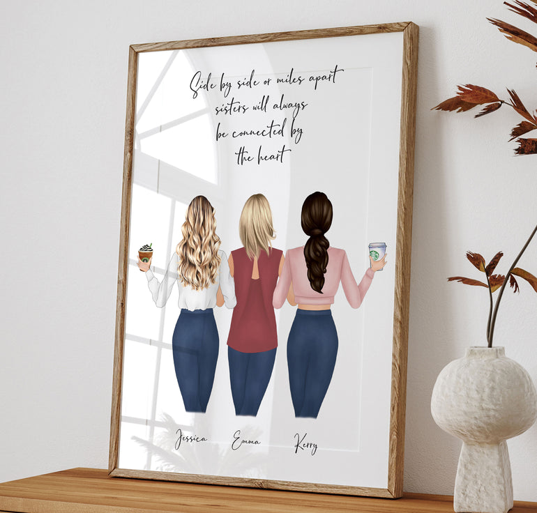 This listing is for 3 Sisters with a beautiful quote 'Side by side or miles apart, sisters will always be connected by the heart'.