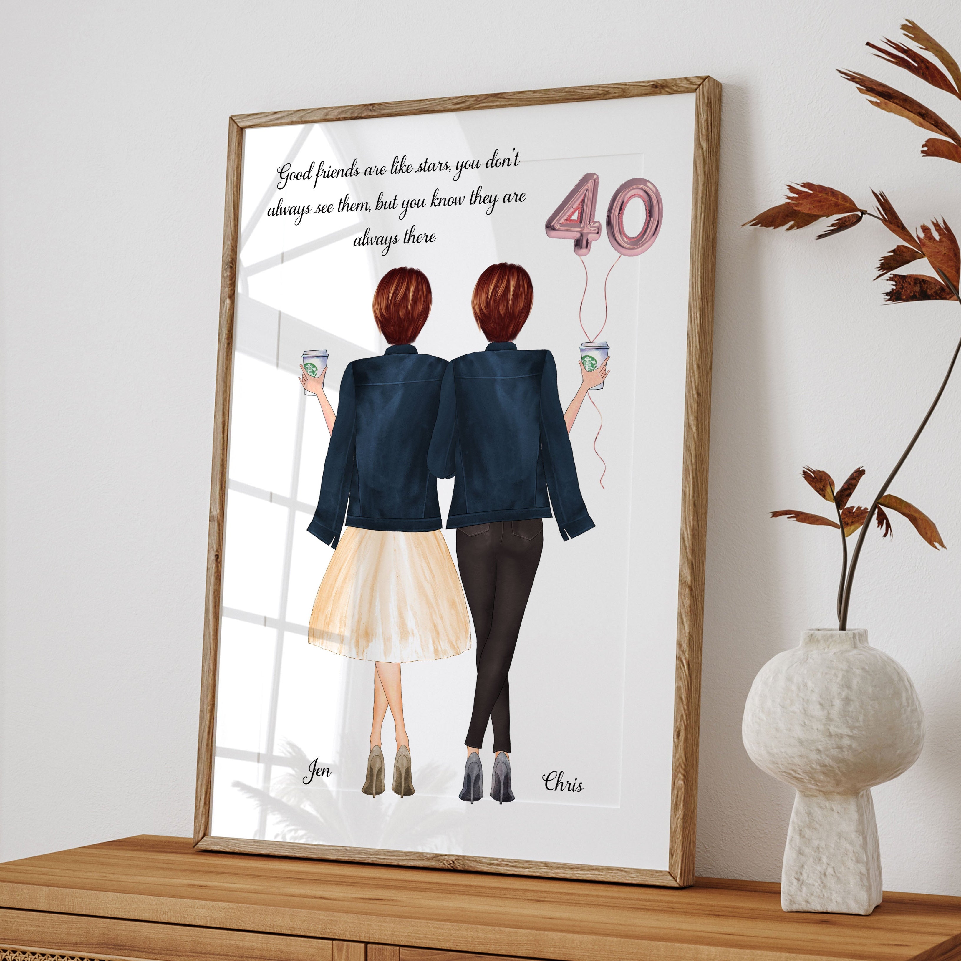 40th Birthday Gift - 2 Friends Portrait Illustration Personalised Print