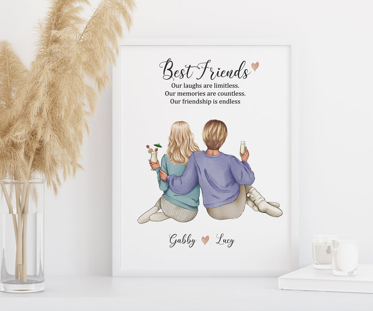 Our Customisable Best Friend Gift Print is a thoughtful unique gift or keepsake for you and your best friend. Perfect for birthdays, Galentines, Christmas or thinking of you gift. Customise hairstyles, skin colour and drinks with this beautiful quote. UNFRAMED PRINT.