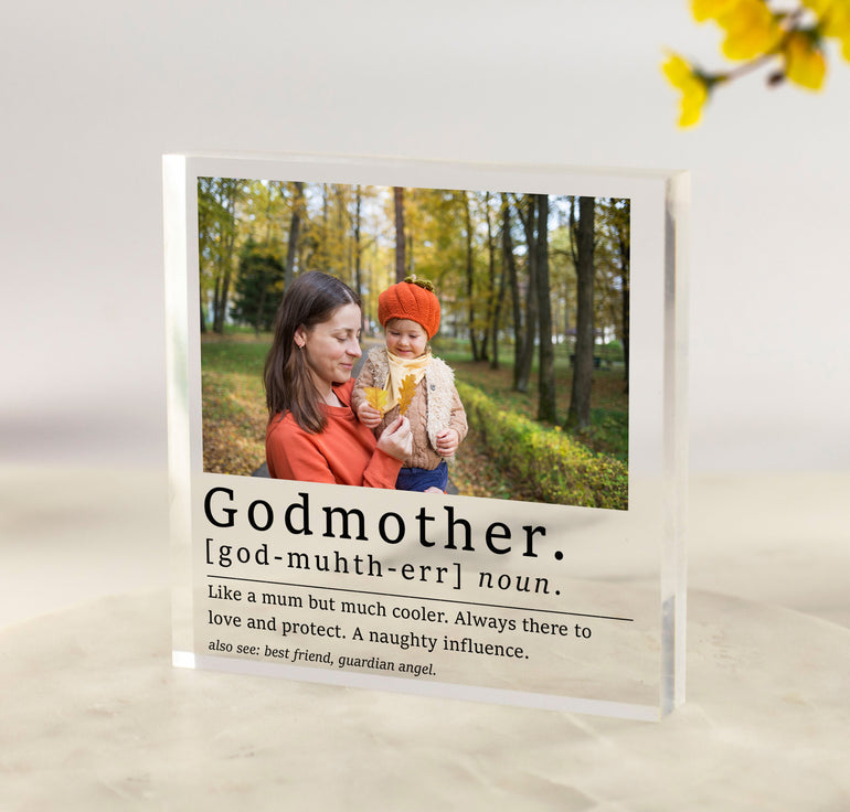 Introducing the Godmother Personalised Definition - Acrylic Photo Block. Show your appreciation to your Godmother with this beautiful and unique keepsake. Made from acrylic, this photo block displays a heartfelt definition of a Godmother, making it a perfect gift that will be treasured for years to come.