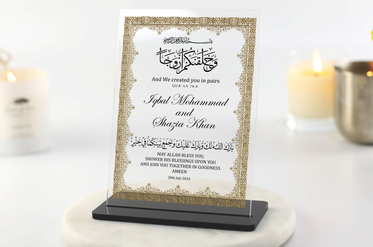 Our acrylic plaque comes with a slimline stand, creating a modern and sophisticated look. But what sets this gift apart is the elegant Arabic verse print. The verse we have chosen is "And we created you in pairs," a beautiful reminder of the divine wisdom in the creation of marriage and the bond between husband and wife.