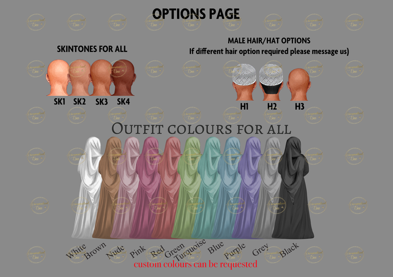 Add couple’s names (e.g., Fahim & Laiba) along with customisation details for skintones & clothing