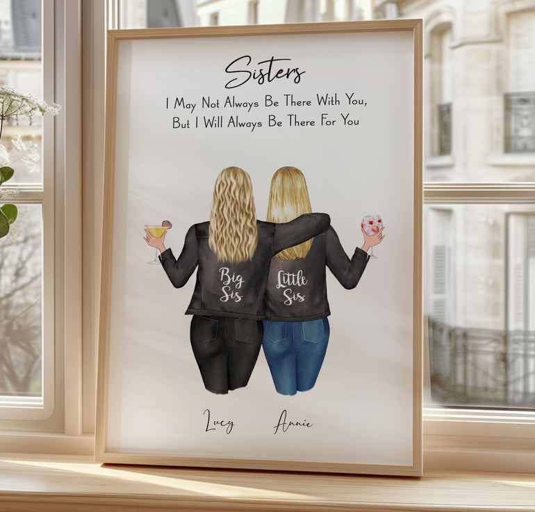 Our Customisable Big Sis Little Sis Print is a thoughtful unique gift or keepsake for you and your sister or friend. Perfect for birthdays, Galentines, Christmas or thinking of you gift. Customise hairstyles, skin colour, body shape, jeans colour and drinks with this beautiful quote. UNFRAMED PRINT.