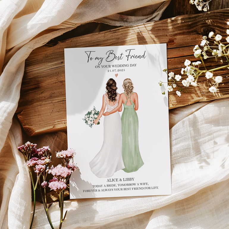 Gift your best friend a personalised wedding keepsake that she'll treasure forever. This custom portrait print is a heartfelt way to commemorate her big day. Designed with love, this unique best friend wedding gift can be fully customised to reflect your friendship with personalized details.