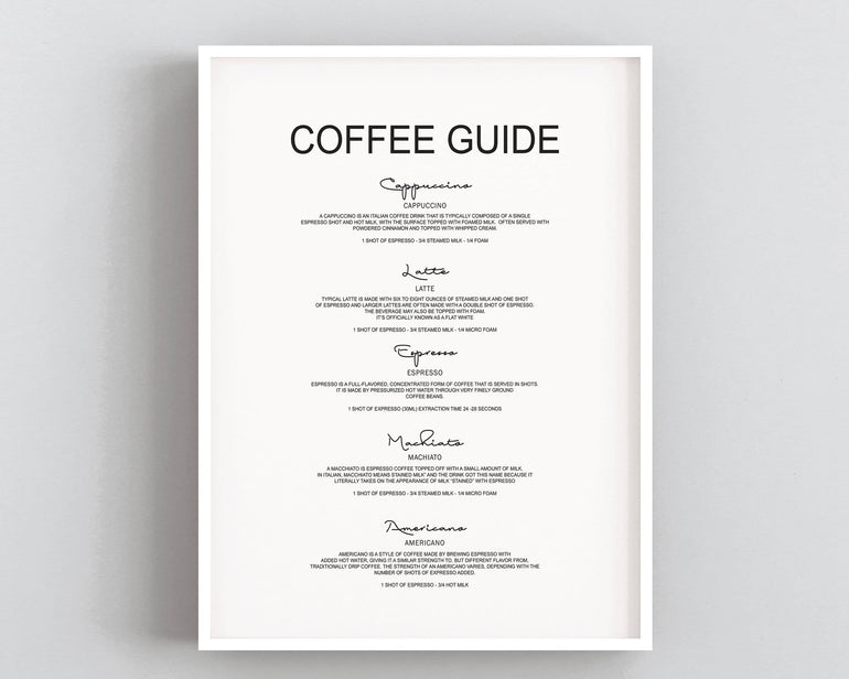 This Simple and elegant Coffee Wall Art is the perfect Wall Décor for all Coffee enthusiasts! And why not pair it with our matching Wine Guide or Watercolour Cocktail Recipes Print?
