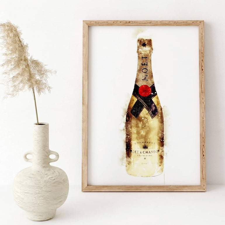This Watercolour Moet Champagne Bottle Print is the perfect Wall Décor for all Champagne Lover! Adds that wow factor to any kitchen, dining room or Living room. It would also make the perfect gift as a house warming or birthday present or Fathers day Gift, Grandad Gift. Or Personalise for a graduation or wedding gift as we can add text above or below the bottle. Send us a note if required and we will send draft versions before finalising.