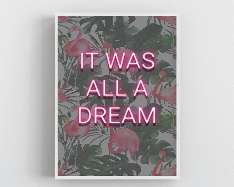 It Was All A Dream Quote, Neon Pink Font with Flamingo Background - Print