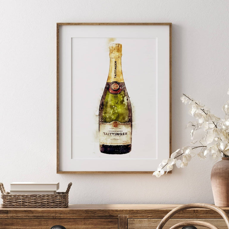 This Watercolour Taittinger Champagne Bottle Print is the perfect Wall Décor for all Champagne Lover! Adds that wow factor to any kitchen, dining room or Living room. It would also make the perfect gift as a house warming or birthday present or Fathers day Gift, Grandad Gift. Or Personalise for a graduation or wedding gift as we can add text above or below the bottle.