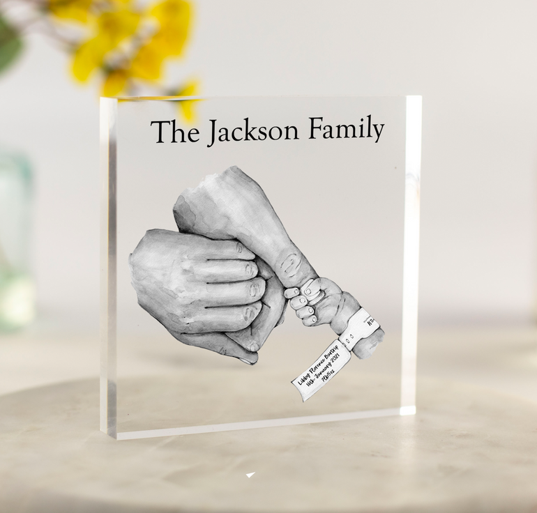 We will create this custom Family Hands acrylic block with the baby's name and date printed underneath along with family name.