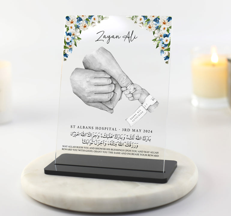 The Muslim Boy Gift with Arabic Dua - Couple and Baby Hands Print is a beautiful, personalised acrylic plaque designed for new parents to celebrate the arrival of their baby boy. The plaque features a stunning floral design, adding a touch of elegance and sophistication to any room in the home. With a slimline stand, it is ready to be displayed as soon as it arrives, making it a practical and thoughtful gift.