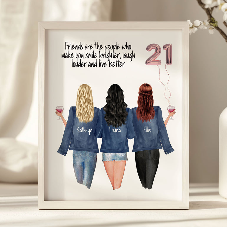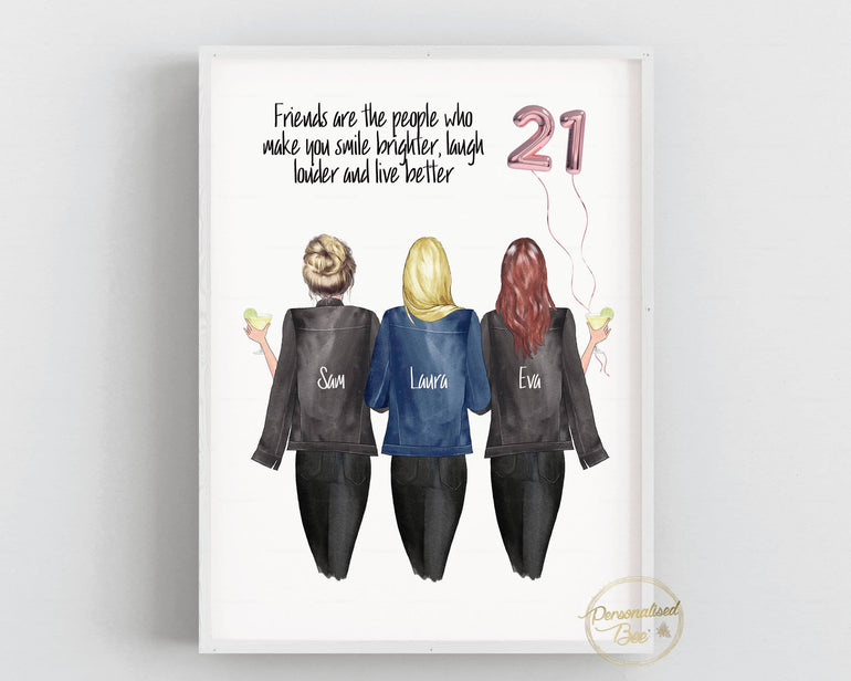 21st Birthday Gift For Her - 3 Friends Personalised Print