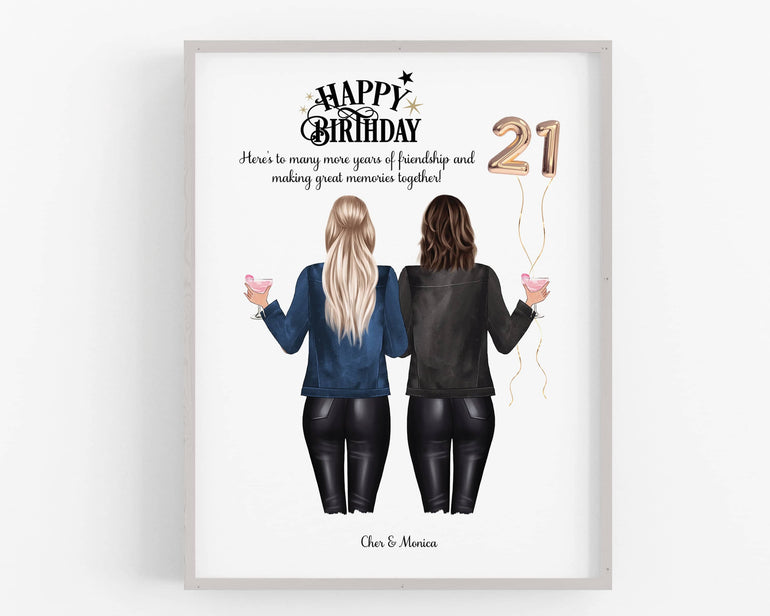Personalised Best Friends Unframed Print, 21st Birthday Gift - Customise Name, Hair, Clothing and Balloons.