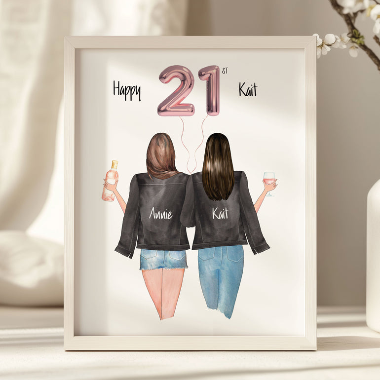Our Customisable Friendship Print is an ideal, personalised gift for couples or friends celebrating a 21st birthday. Choose from over 60 hairstyle options, customize skin color, jeans or skirt option and drinks as part of this unique and special present. Packaged UNFRAMED.