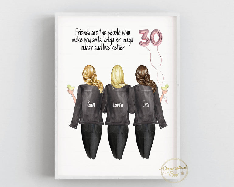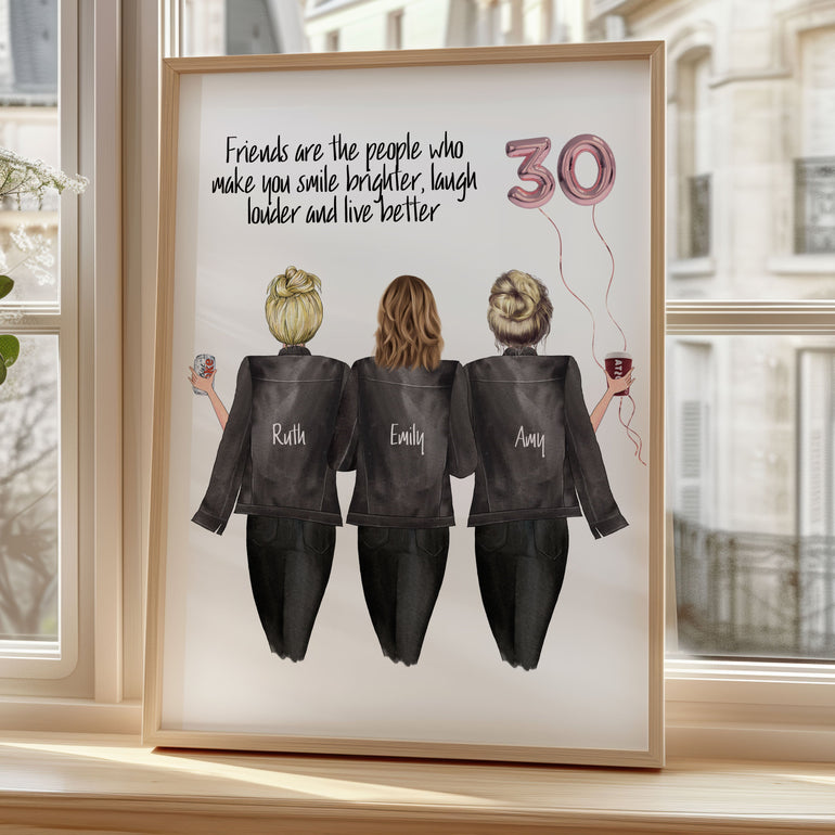 30th Birthday Gift For Her - 3 Friends Customisable Friendship Print