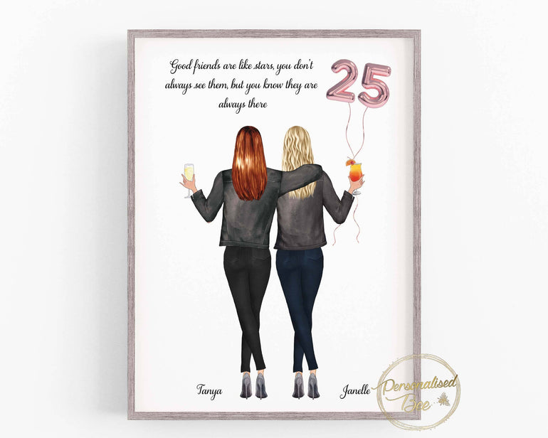 Personalised Best Friends Unframed Print, ANY AGE Birthday Gift - Customise Name, Hair, Clothing and Balloons.