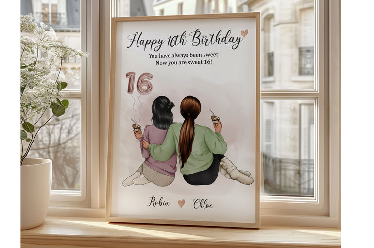 Celebrate her sweet 16 with a personalised birthday gift for her that’s as special as your friendship. This custom illustration print features 2 characters designed to look like you and your best friend, sister, cousin, or daughter — making it a meaningful keepsake she’ll treasure.