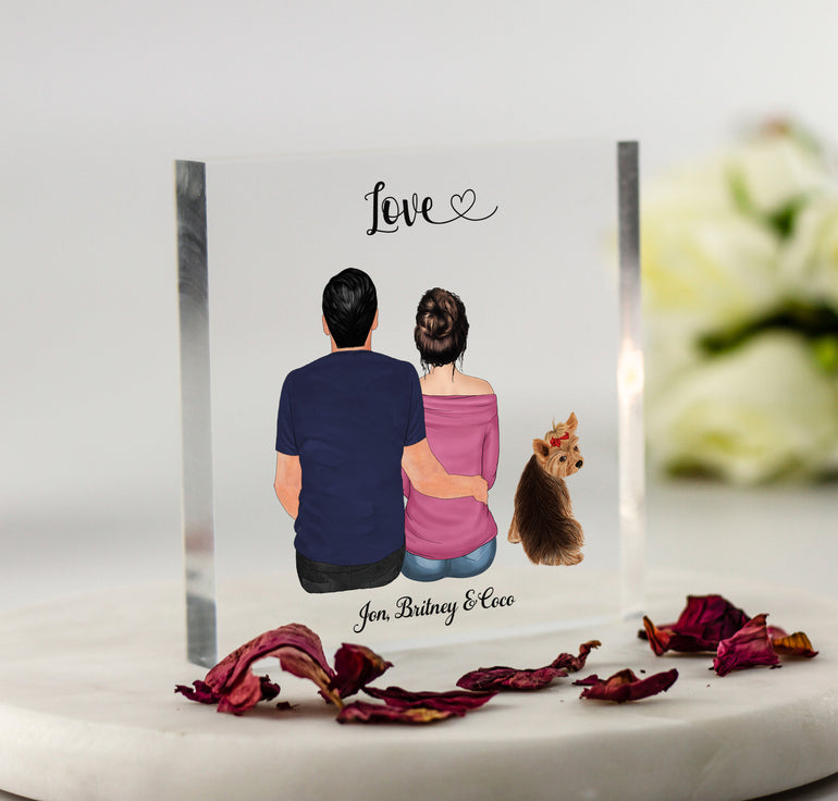 Our Customisable Freestanding Couple & Pet Illustration Printed on a clear Acrylic Block makes a thoughtful unique gift or keepsake for Boyfriend/Girlfriend/Wife/Husband and for any occasion including Valentine's Day, Birthday's, New Home and more