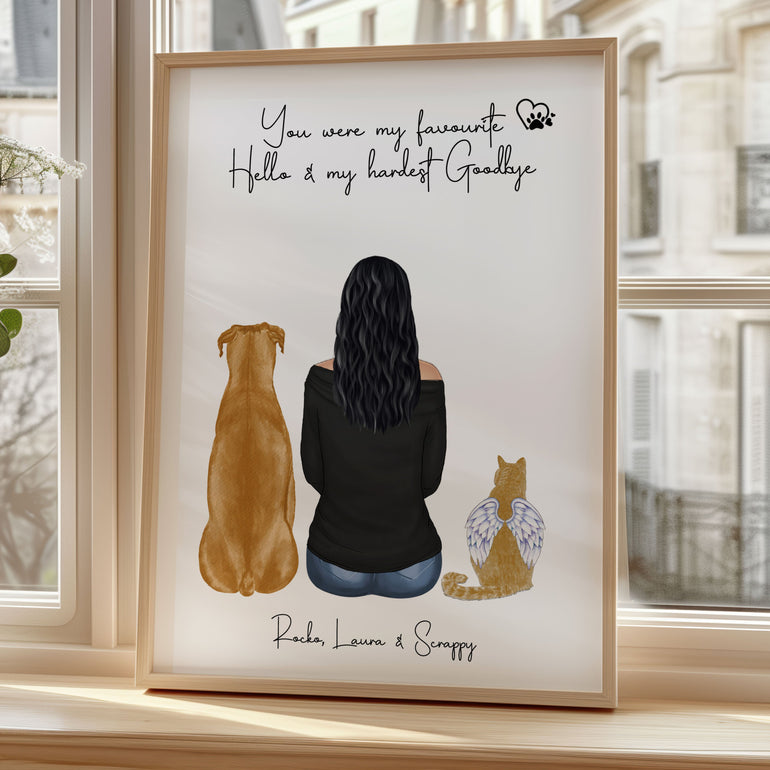 Capture the beauty of your cherished loved ones with our Customisable Girl & Pet Illustration Print - a heartfelt tribute to your beloved furry friend. Personalize every detail from hairstyles to names to create a one-of-a-kind memorial.