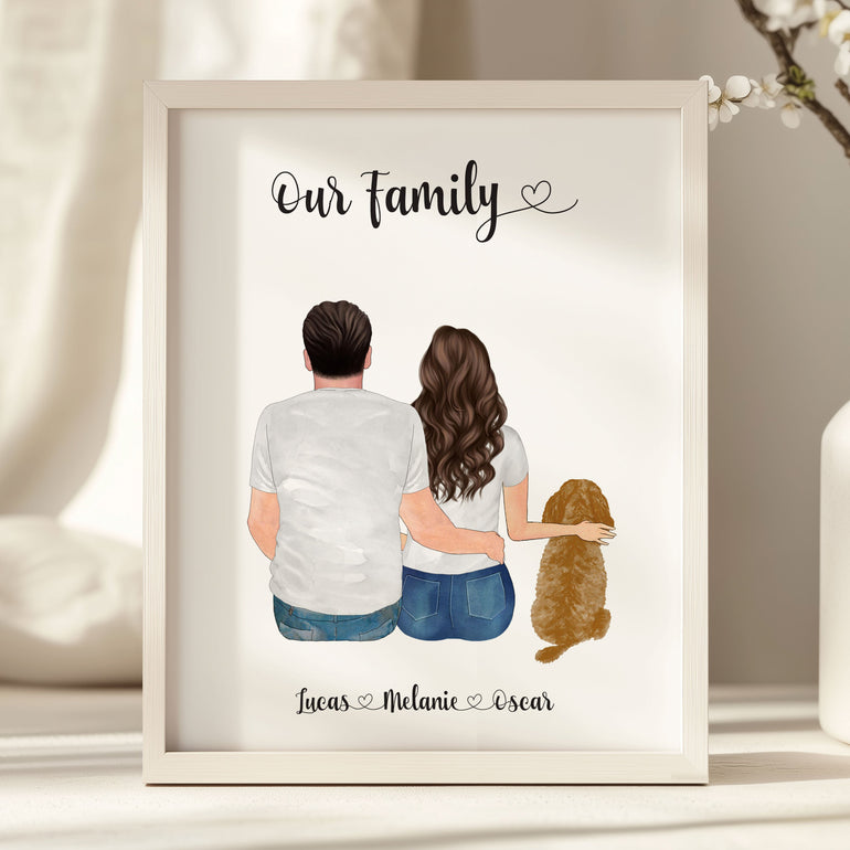 Our Customisable Couple & Pet Print is a thoughtful unique gift or keepsake for any couple, boyfriend, girlfriend. Customise hairstyles, skin colour, clothing, names, pets, wording. UNFRAMED PRINT.