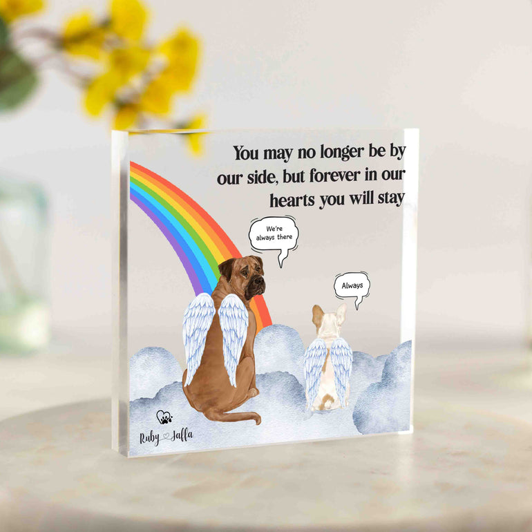 Our Customisable Pet Loss Rainbow Bridge Memory Keepsake Illustration Printed on a clear Freestanding Acrylic Block makes a thoughtful unique gift or keepsake for Pet owners. Can be placed anywhere in the home or office, or as a dainty paper weight.