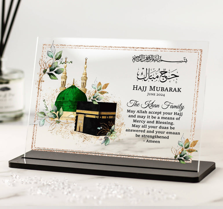 Whether you are looking for a gift for a loved one who has recently returned from the Hajj pilgrimage or for someone who is celebrating a special Islamic occasion, the Hajj Mubarak Acrylic Plaque Gift with Stand - Gold Leaves Frame Design is an excellent choice. With its personalised touch, this gift is sure to be cherished for years to come.