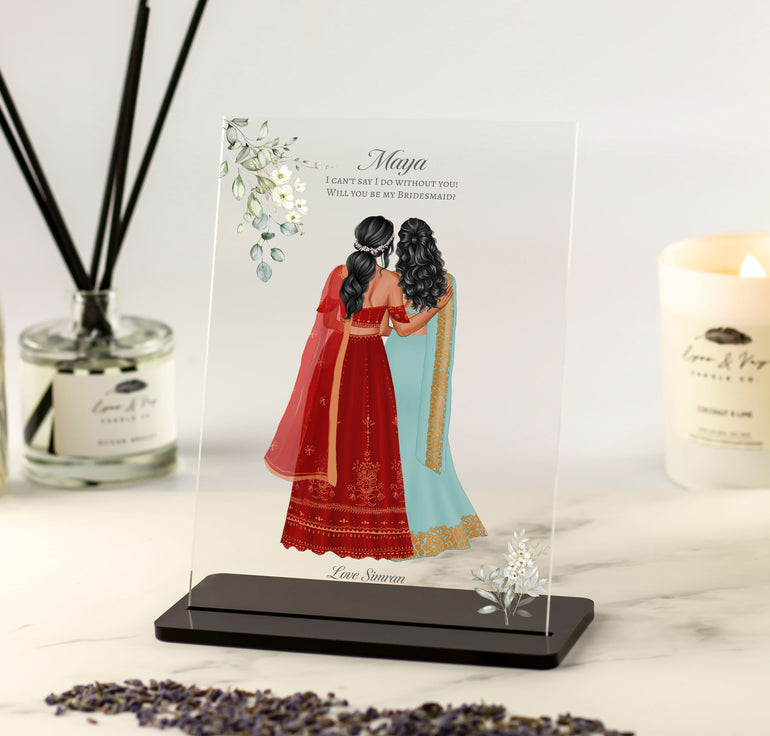 Personalised Asian Bride and Bridesmaid Gift illustration Acrylic Plaque. Custom Portrait of the Bride and Bridesmaid/Maid of Honour/Sister of Bride with a range of Saree and Lehenga choices to select from to create the perfect to gift. Unique elegant gifts for your to be cherished.
