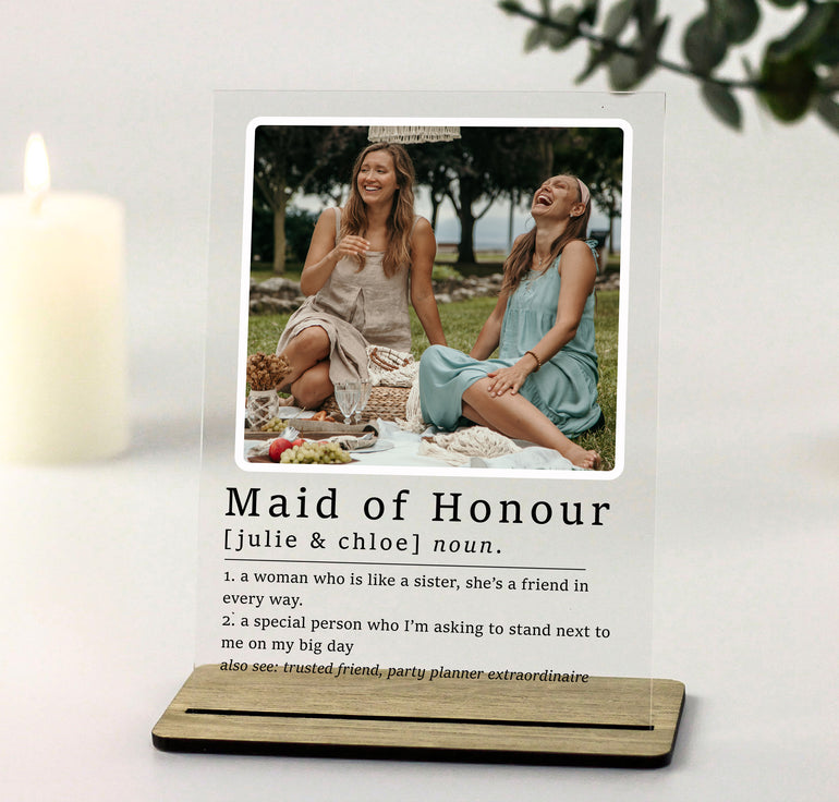 Custom Maid of Honour Definition Noun Photo Acrylic Plaque with slimline stand. NO ADDITIONAL FRAME PURCHASE REQUIRED! Ready to gift to the recipient or send directly with no hassle of buying a frame