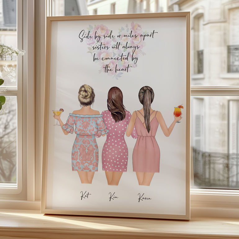 3 Sisters Personalised Print - Customisable Portrait Drawing Print