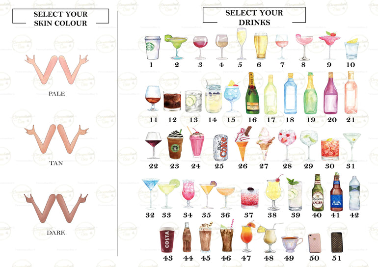 To choose hairstyle, skin color, clothes and drinks options simply use the number corresponding to each customisation in the pictures and add at checkout along with names.
