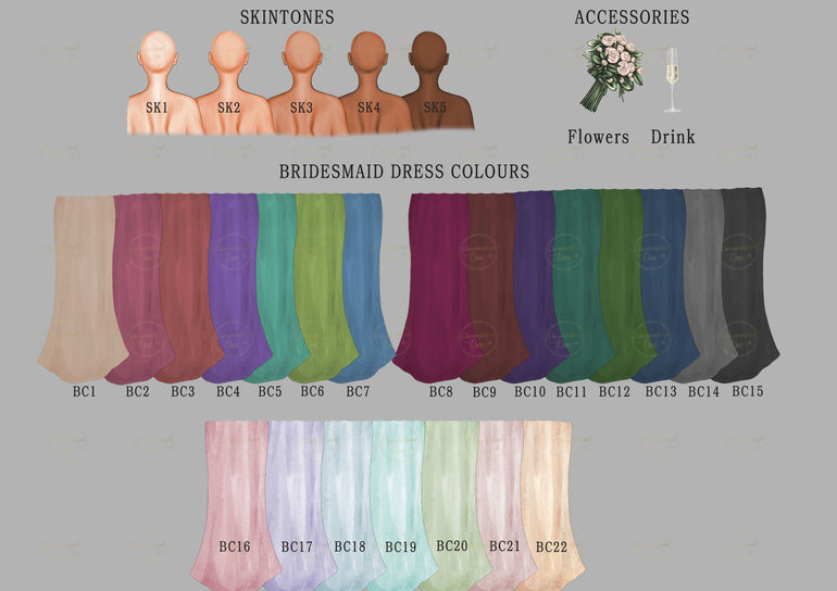 Customise Names, Hair, Outfits and Skin colour to create a unique keepsake gift for your bridal party.