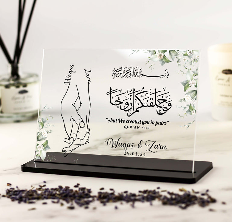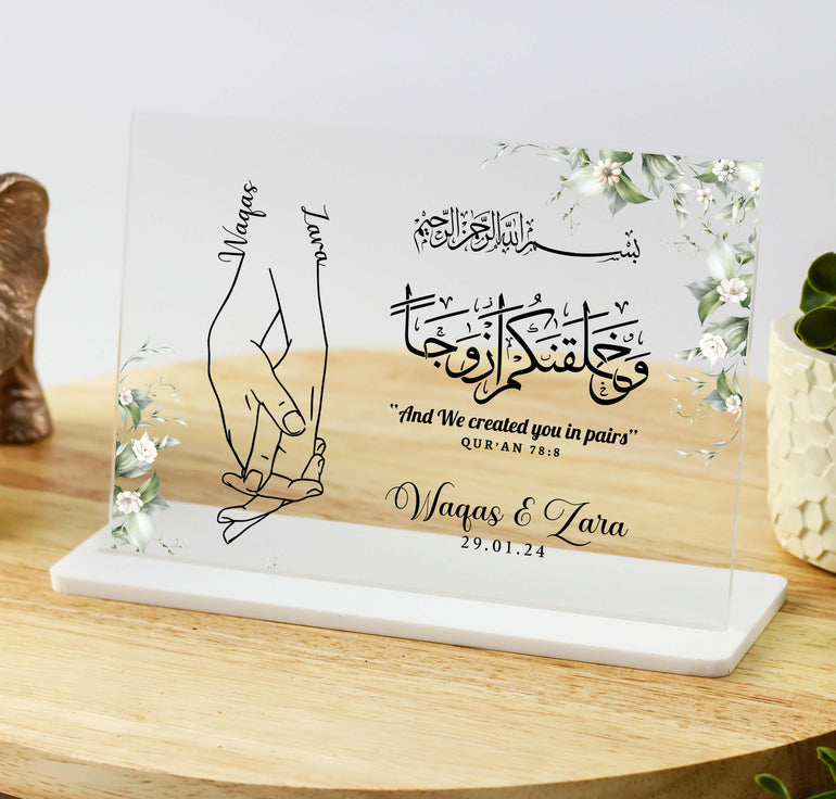 Add a touch of elegance and romance to your home or as a thoughtful gift with the "And We Created You In Pairs" acrylic plaque. This beautiful piece of art features a stunning line drawing of an Islamic couple holding hands, symbolizing unity, love, and companionship.