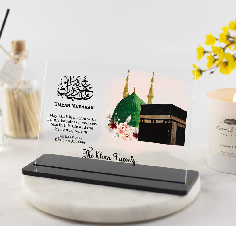 This Umrah Mubarak Personalised Gift Floral Clear Acrylic Plaque is a stunning and thoughtful gift for any Muslim family, making it an ideal present for commemorating special occasions such as Umrah Mubarak or Eid Mubarak. The Kaaba art design displayed on the plaque adds a touch of elegance and spirituality, making it a beautiful addition to any Muslim home.