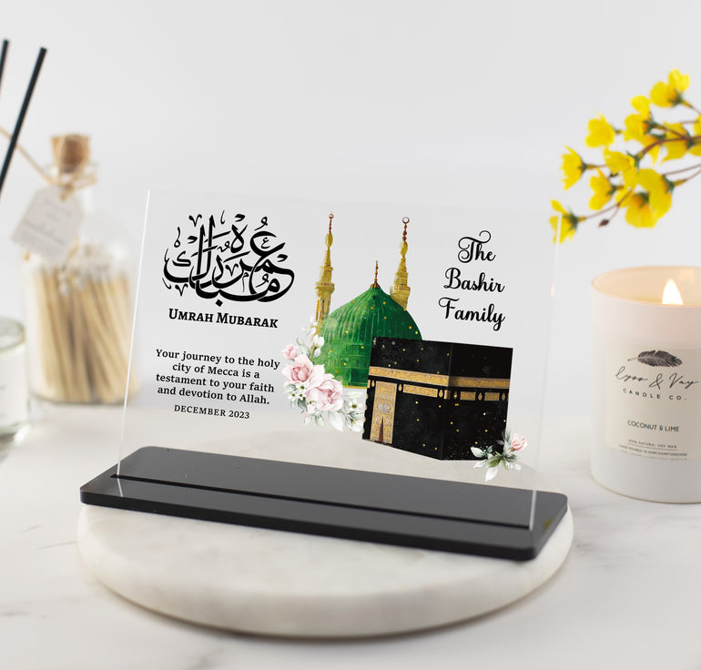 This Umrah Mubarak Personalised Gift Floral Clear Acrylic Plaque is a stunning and thoughtful gift for any Muslim family, making it an ideal present for commemorating special occasions such as Umrah Mubarak or Eid Mubarak. The Kaaba art design displayed on the plaque adds a touch of elegance and spirituality, making it a beautiful addition to any Muslim home.