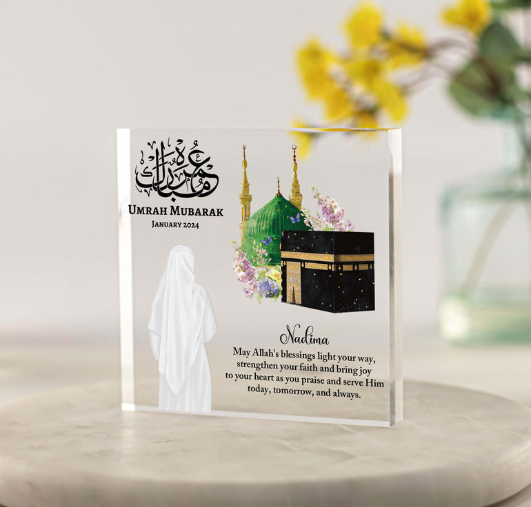 This exquisite and meaningful Umrah Mubarak Personalised Acrylic Block is a perfect gift for any special woman in your life, who has recently completed the Umrah pilgrimage or is about to embark on this spiritual journey. This beautiful, freestanding acrylic block is intricately designed with a stunning illustration of a hijab-wearing girl, standing in front of the Kaaba, the holiest site in Islam. Her peaceful expression and the serene background convey the sense of tranquility, devotion, and spiritual growth that comes with performing Umrah.