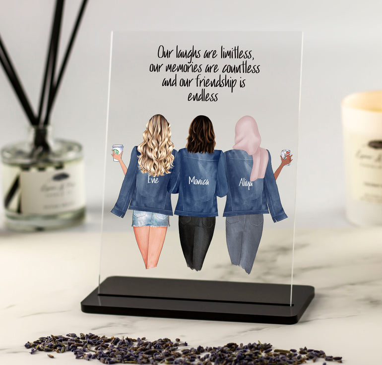 Friendship Gift 3 Best Friends Illustration Personalised Print - Acrylic Plaque with Stand