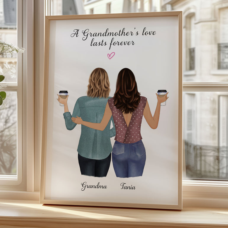 Our Customisable Grandma & Grandaughter Print is a thoughtful unique gift or keepsake for you and your Gran. Perfect for birthdays, Valentines, Christmas or thinking of you gift. Customise hairstyles, skin colour and drinks with this beautiful quote. UNFRAMED PRINT.