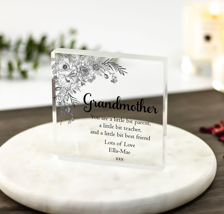 Our Personalised Grandmother Acrylic Freestanding Block 10cmx10cmx1.5cm makes a thoughtful unique gift for Christmas, Birthdays or just to let your Nan know how much you care.
